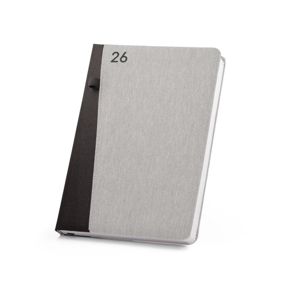 A5 diary in recycled polyester (100% rPET). It has a biro holder (not included) and a ribbon marker. It is organised into a daily plan, with pages made from FSC™ certified material and other controlled materials. Supplied with a non-woven pouch. 148 x 210 mm | Pouch: 205 x 250 mm
