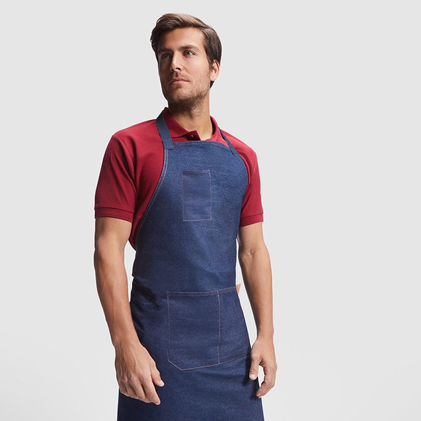 Kitchen apron made of recycled denim, 280gr/m2, with a large front pocket and coordinated colored neck and waist ties.
