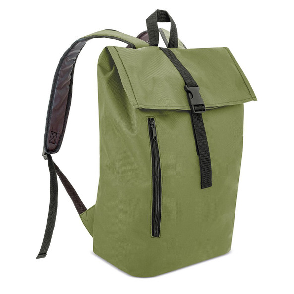 Roll-top backpack made of RPET, with adjustable buckle closure, front pocket with zipper. Adjustable padded shoulder straps. External RPET label