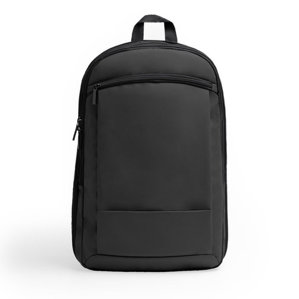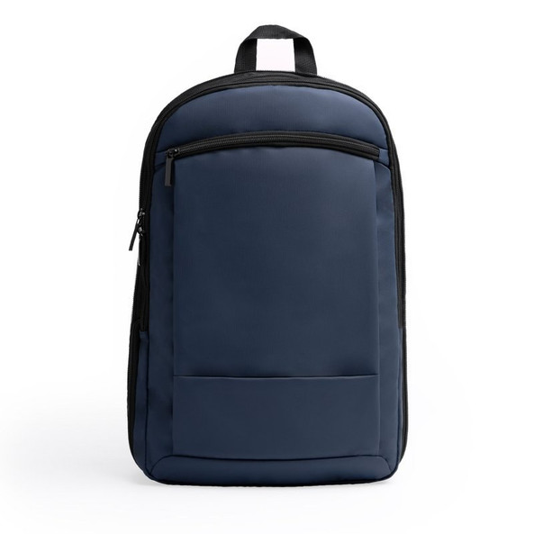Expandable computer backpack made of RPET and PU. Main compartment with padded internal pocket suitable for a laptop up to 17 inches. Front pocket with zip. Side pocket with zip. Adjustable padded shoulder straps. Strap to attach it to a trolley. Capacity 15 liters.