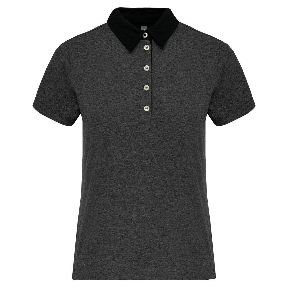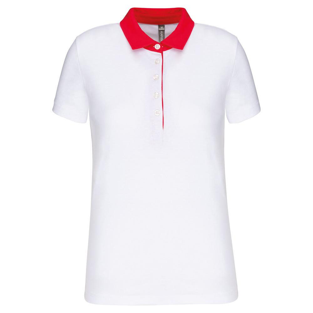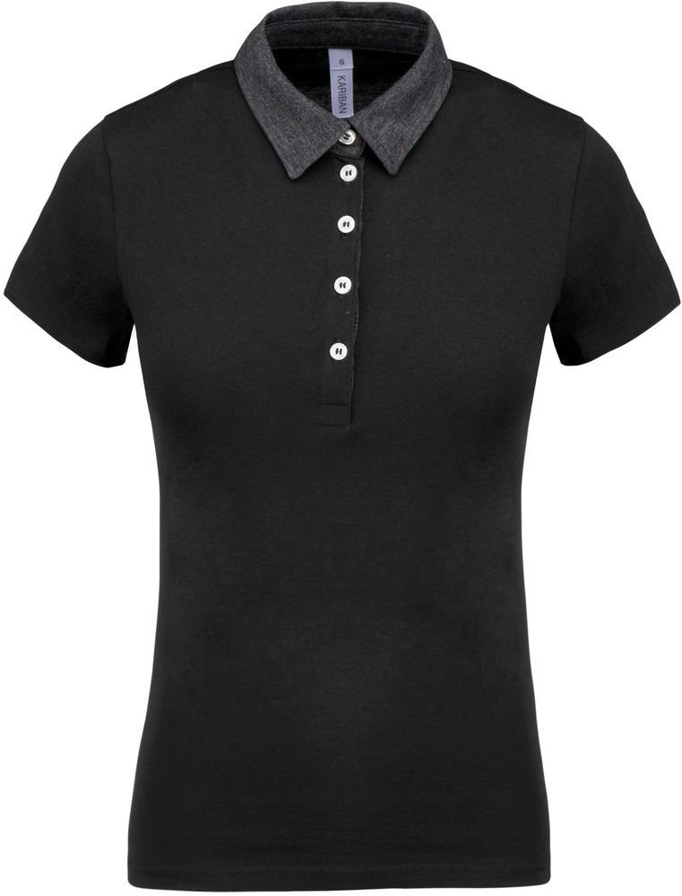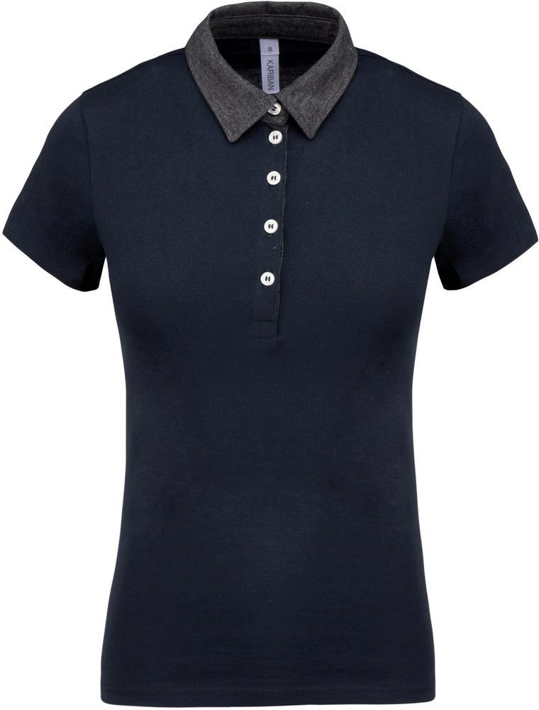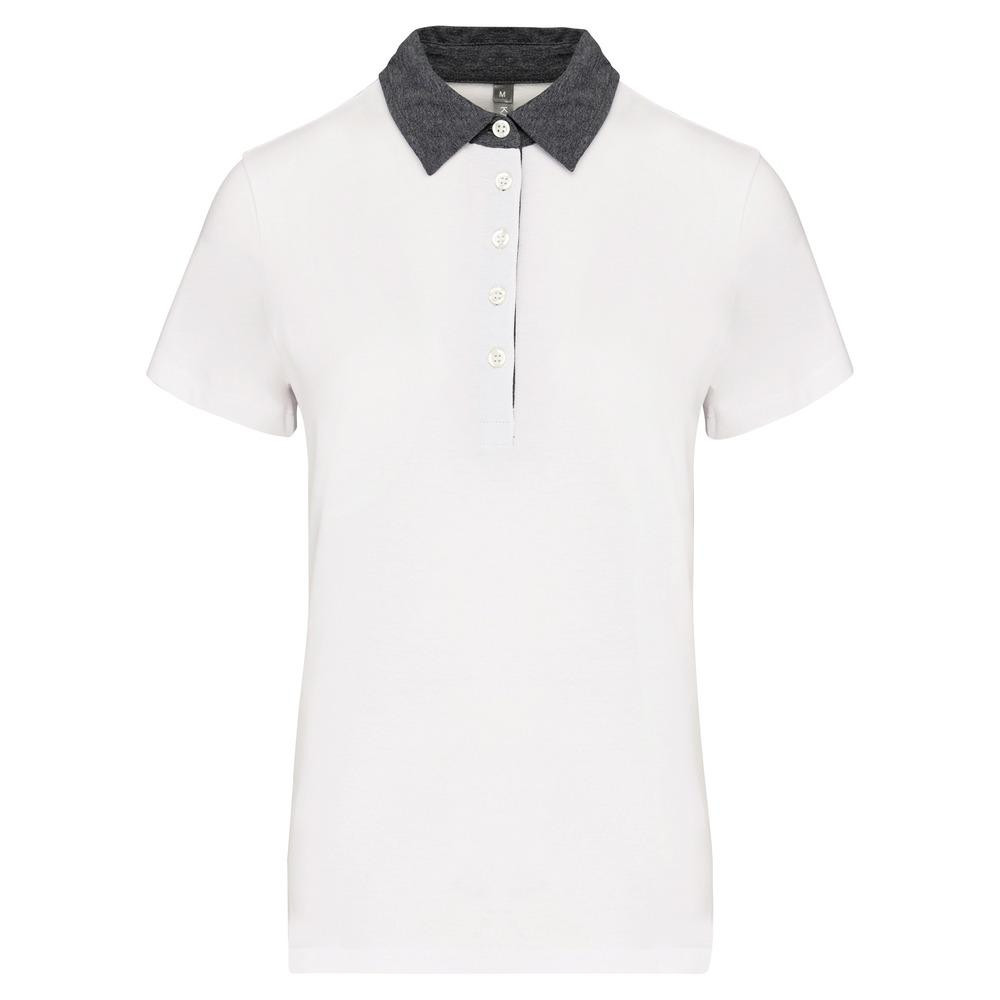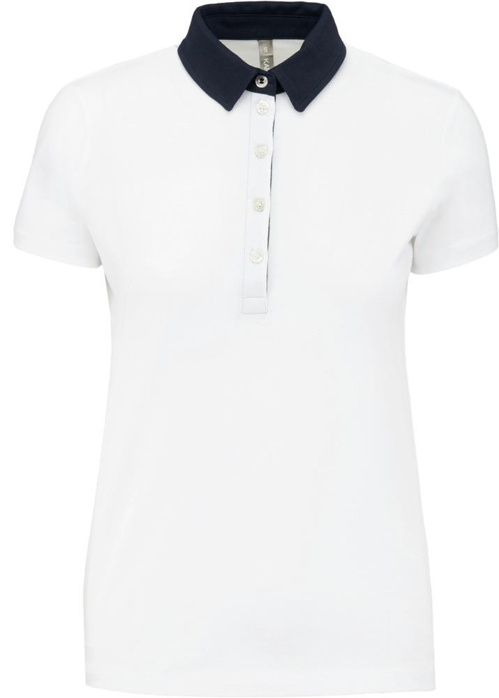 Contrasting neck and inner placket with 5 white faux pearl buttons.
