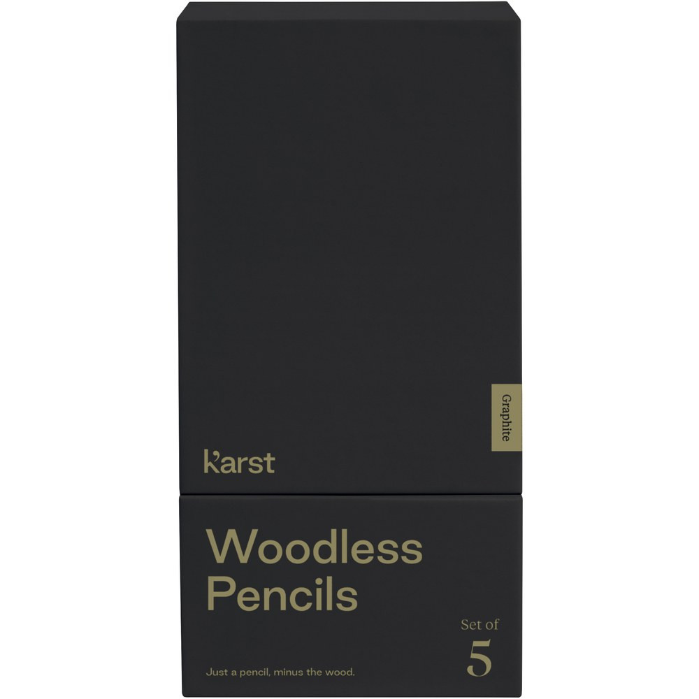 Set of 5 graphite pencils that offers 5 times more graphite per pencil. The woodless body can be sharpened for crisp line work or made blunt for expressive strokes or subtle shading. The woodless construction allows versatility while saving the mess of traditional wood shavings. The solid weight of these pencils feels luxurious in the hand whether you write, scribble, doodle or draw.