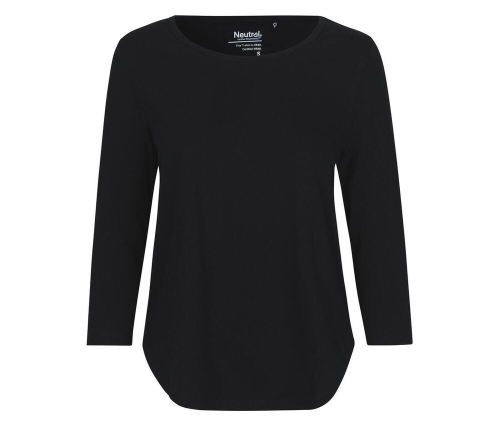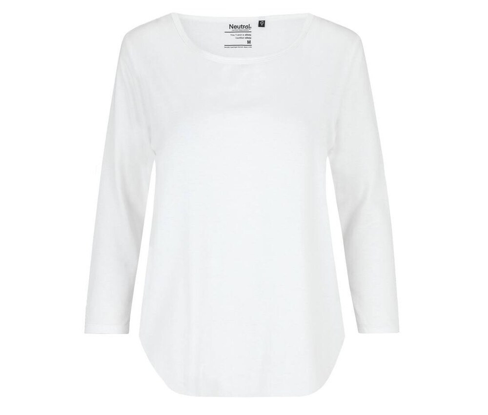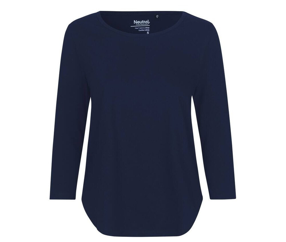 this O81006 t-shirt from the Neutral brand . It is simple , chic and elegant at the same time . This women 's t-shirt has a rather special look. It comes with 3/4 sleeves and rounded edges . Its collar is round and has a visible cleanliness band , for the design. It can also be worn with jeans, suits, but also shorts. The t-shirt is made in a light and airy fabric , and can even be worn in the office. It is offered in sizes XS to 2XL with the colors black, navy blue and white, take your pick.
