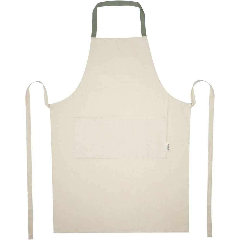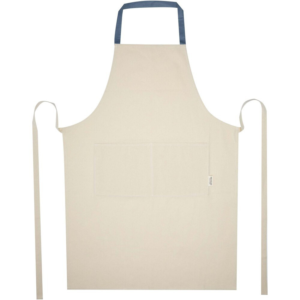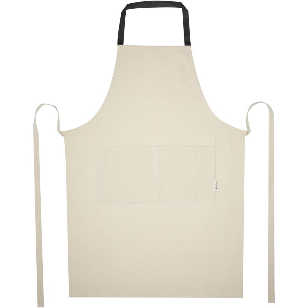 The Nia apron is crafted from 100% GRS certified 200 g/m² recycled cotton. With its natural cotton colour and contrasted neck loop, this apron will protect your clothes during your cooking session. Featuring two adjacent pockets with a combined size of 45 x 20 cm and a 1-metre long tie-back closure, the Nia apron ensures both practicality and style in your kitchen endeavours.