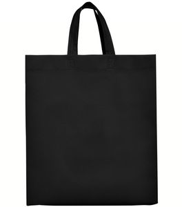 Heat-sealed bag with gusset on the sides and base, and matching short handles, made of non-woven fabric.