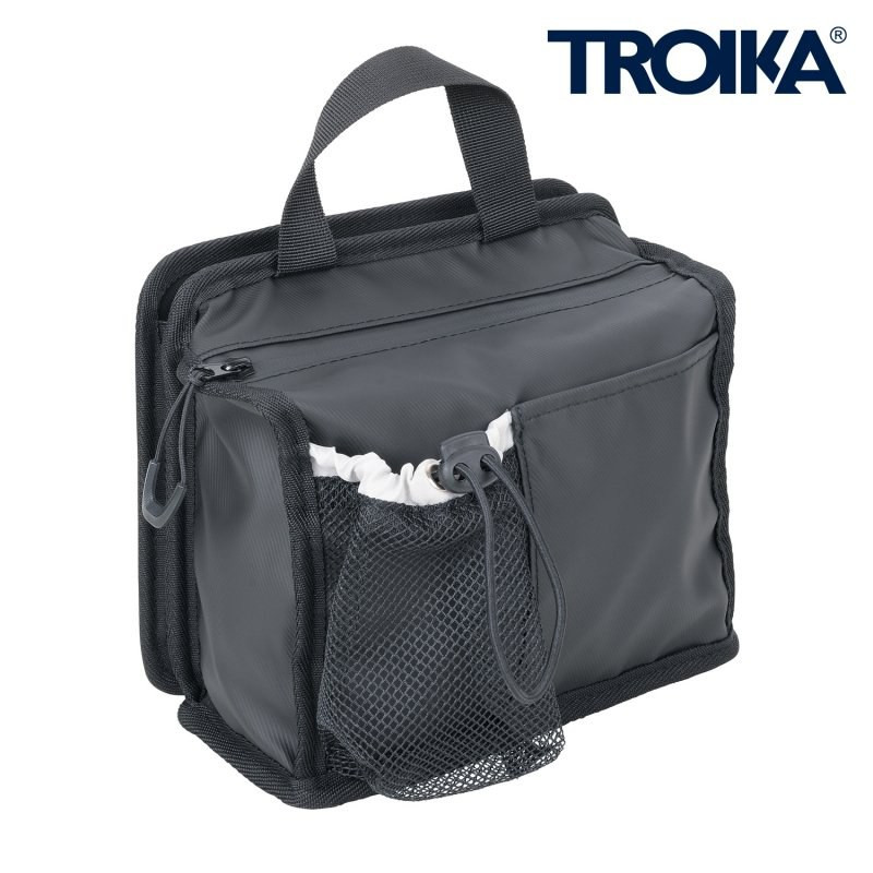 Trolley organizer for attachment to a travel or trade fair trolley, two front compartments for water bottle and smartphone, spacious main compartment with pen loop, inner compartment with zipper, two elastic straps for cable organization, mesh pocket for power bank or business cards, transparent compartment for e.g. tickets, hand strap, water-repellent zippers, splash-proof (IPX4 waterproof rating), tarpaulin: 80% polyester, 20% polyurethane (PU), polyester, polyurethane, tarpaulin (tarp), black