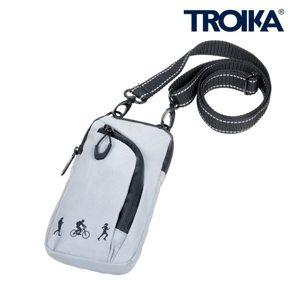 Mobile phone shoulder bag with 2 zipped compartments, highly reflective, incl. shoulder strap with reflective stripes and snap hook for fastening, for sport and leisure, main compartment suitable for common smartphones, front compartment for e.g. wireless in-ear headphones, keys, cards, rubberized zippers, splash-proof (IPX4 waterproof grade), padded back, 100% polyester, polyester, black/grey