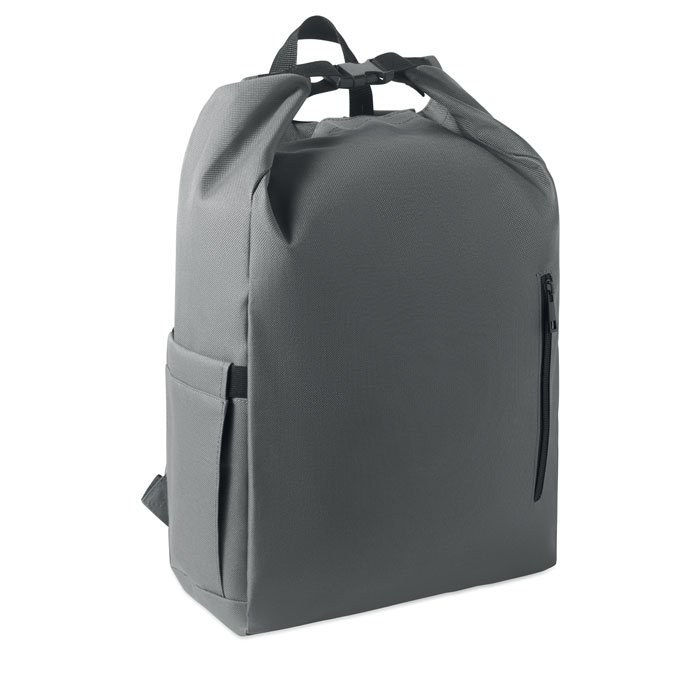 15-inch roll top laptop backpack made of 600D RPET polyester with 210D RPET padded lining.