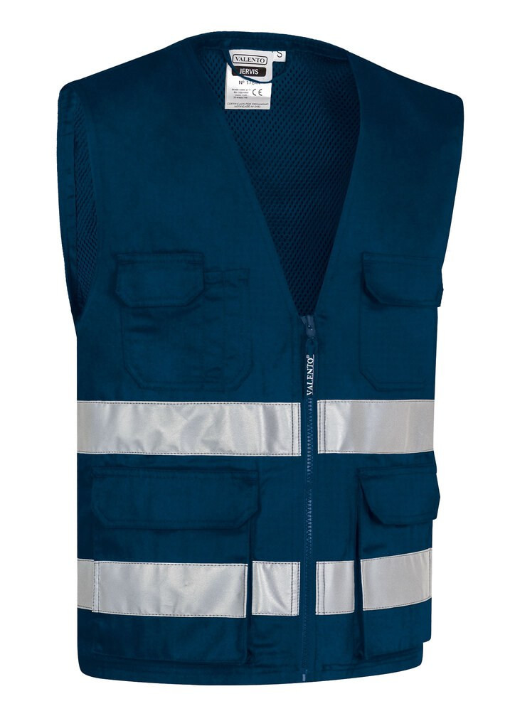 Enhanced Visibility Multi-Pocket Vest.Made of a sturdy cotton twill fabric blended with polyester for strength and durability and an inner back mesh lining for improved breathability and a better airflow, includes two sewn reflective tapes on torso and back to enhance user visibility. Garment certified as an Enhanced Visibility Category II PPE based on 13688 and 17353 standards, type B3 for night visibility.Full-zip front closure and opened V-neck for extra comfort.Two front gusseted pockets and side slits leading to two more pockets, two upper pockets, all with velcro flap closure for a secure and convenient storage, also includes two pen holders. Includes an inside back zip for easy marking with different methods: screen printing, embroidery, transfer printing, stitching, vinyl application. Ideal as workwear and uniforms.