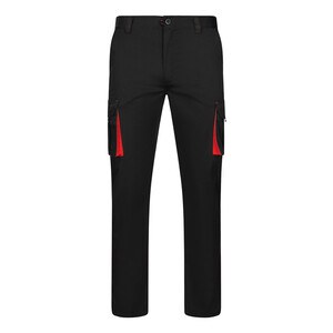 Two-tone, multi-pocket stretch trousers (240g/m²), in cotton (46%), EME (38%) and polyester (16%). Slim Fit, elasticated waistband and contrasting colour on the gussets, pullers and stitching. Contains six pockets (2 French pockets, 2 side gusset pockets and 2 back gusset pockets)